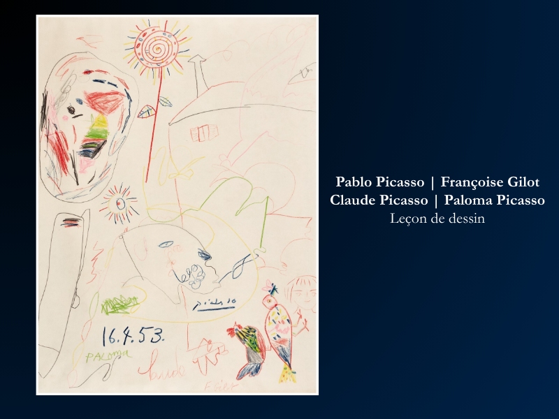 Executed on April 16, 1953, Leçon de dessin (Drawing Lesson) is more than a work on paper; it is a historical document of a family unit.